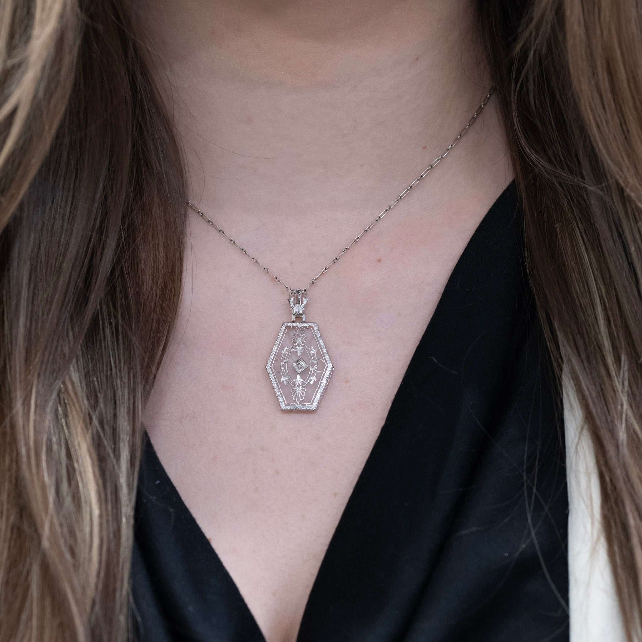 This vintage Art Deco necklace showcases a delicate 14k white gold filigree pendant resting on camphor glass, creating an elegant and timeless look. At its center, a sparkling 0.01ctw diamond adds just the right touch of brilliance, making it perfect for adding understated sophistication to any outfit. Its dainty design ensures it complements both everyday wear and special occasions with graceful charm.