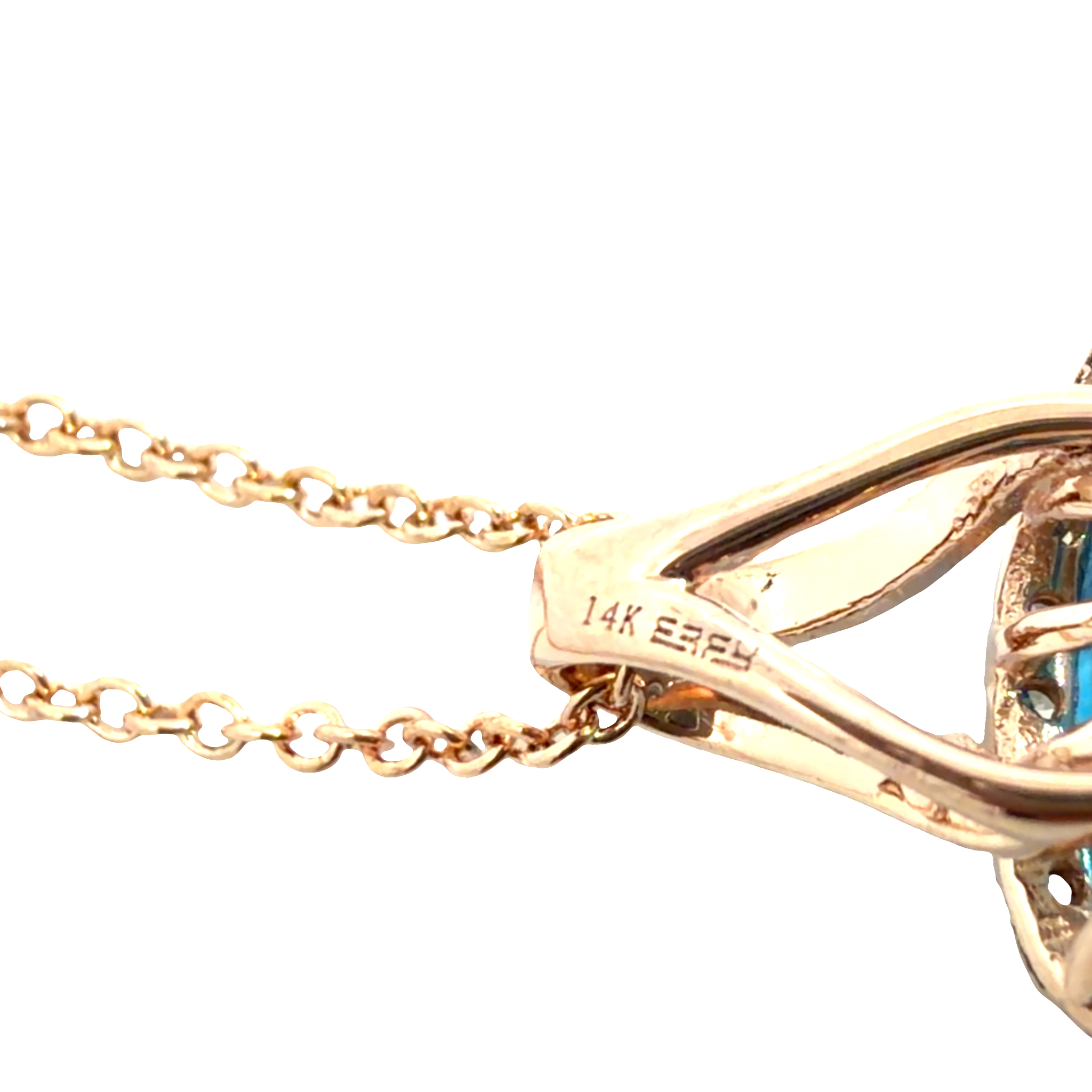 Elevate your elegance with this stunning 14k rose gold pendant by Effy, featuring a vibrant 4.99ctw cushion cut blue topaz centerpiece surrounded by a sparkling 0.11ctw diamond halo. Suspended from an 18-inch chain, this exquisite charm necklace blends timeless sophistication with a touch of modern glamour—perfect for adding a radiant pop of color to any outfit.