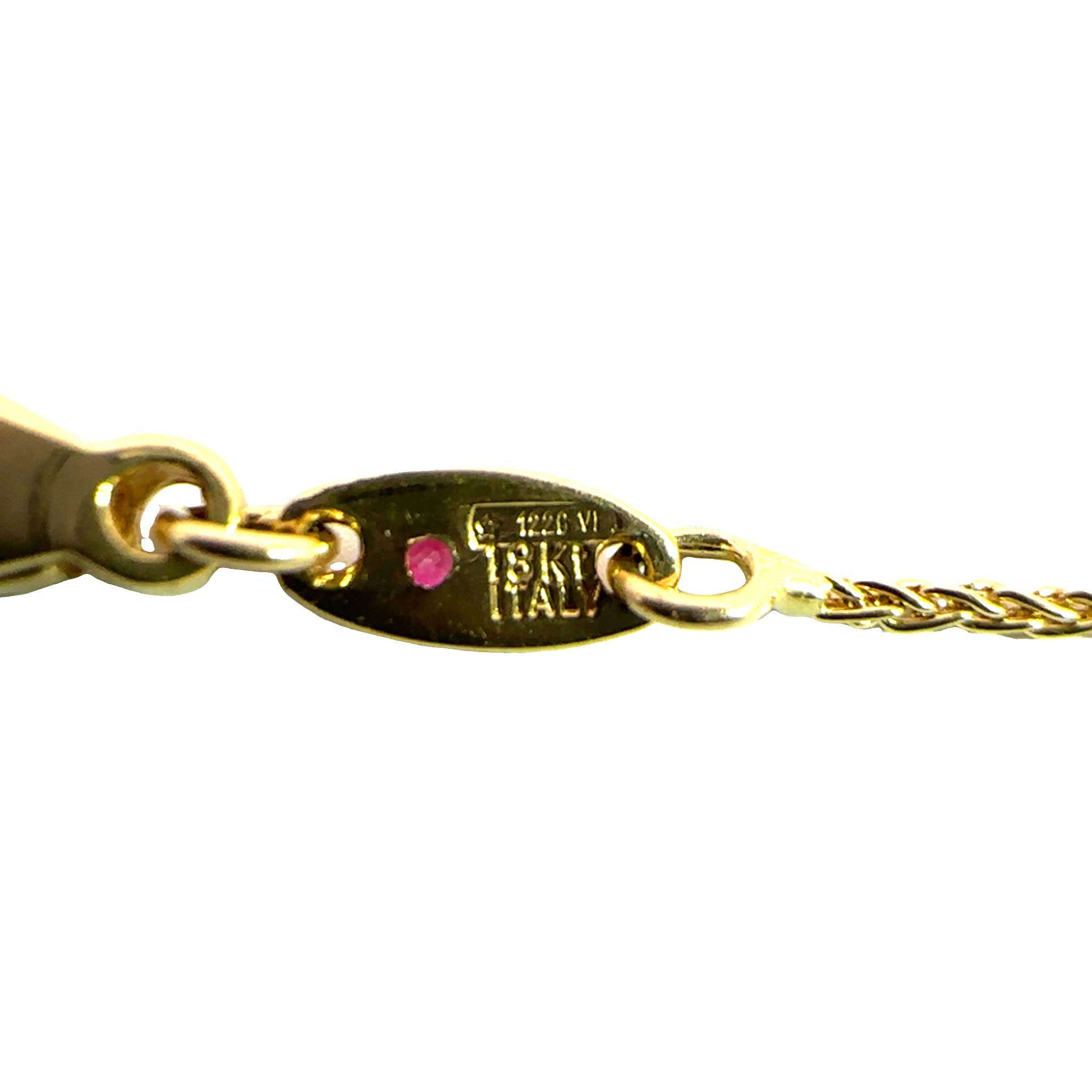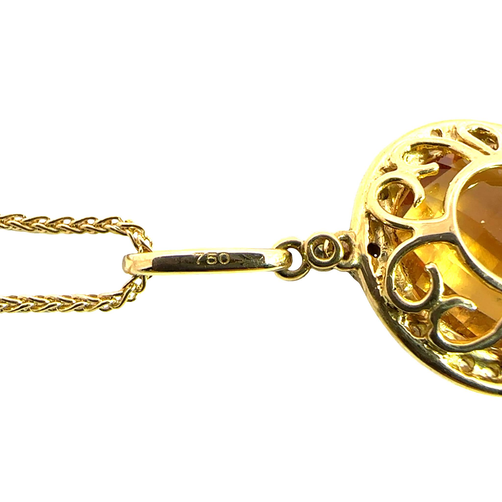 A warm glow with timeless sophistication. This vintage 18k yellow gold pendant necklace features a dazzling 5.53-carat round citrine, its honeyed brilliance framed by a delicate halo of diamonds totaling 0.11 carats. The pendant’s graceful diamond-accented bail adds an elegant vertical line of sparkle, perfectly complementing the rich golden tones of the citrine. Suspended from an 18-inch chain, this piece radiates effortless vintage charm — a luminous statement of refined taste and golden warmth.