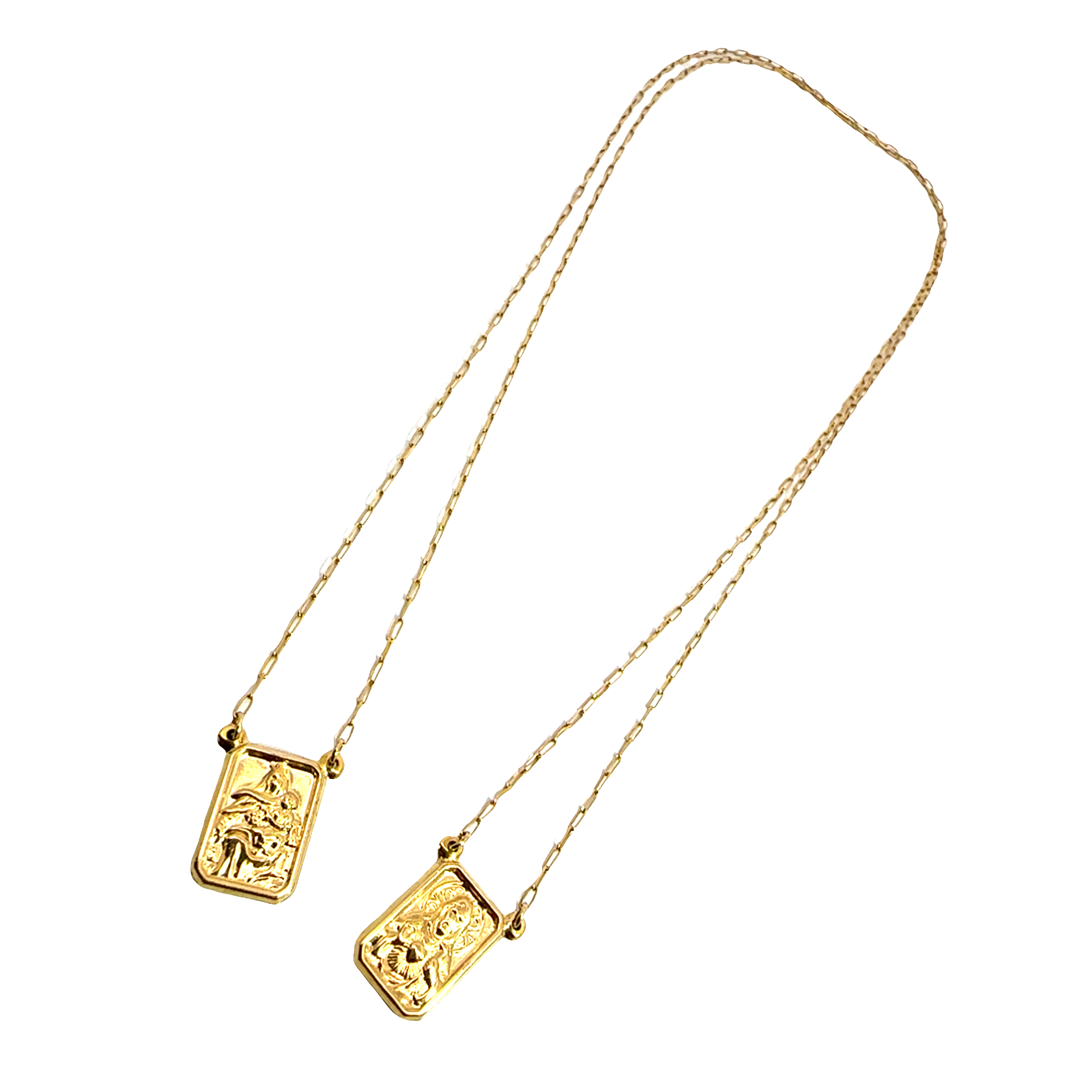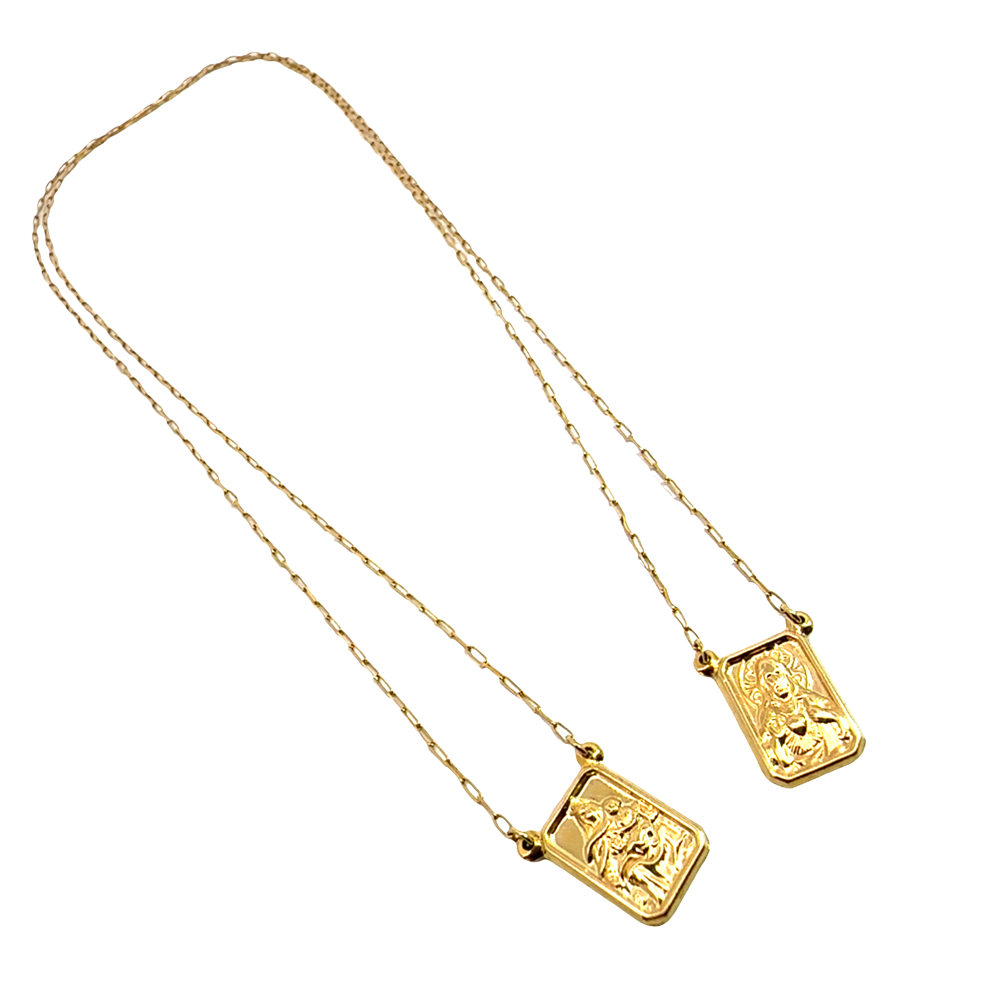 A timeless symbol of faith and devotion, this 18K yellow gold scapular necklace features two beautifully detailed pendants—one depicting the Sacred Heart of Jesus, the other the Virgin of Mt. Carmel. Each side is rendered in radiant gold, suspended from an elegant link chain that drapes gracefully when worn.