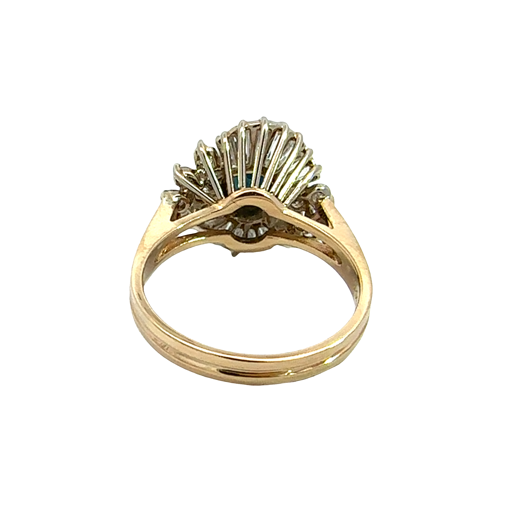 This stunning cocktail ring showcases a rich blue sapphire surrounded by a brilliant halo of baguette-cut diamonds arranged in a floral burst pattern. Set in gleaming yellow gold, the sapphire’s vibrant hue shines with unmatched beauty. With its vintage-inspired design, this elegant ring promises to capture attention and elevate your style at every special event.