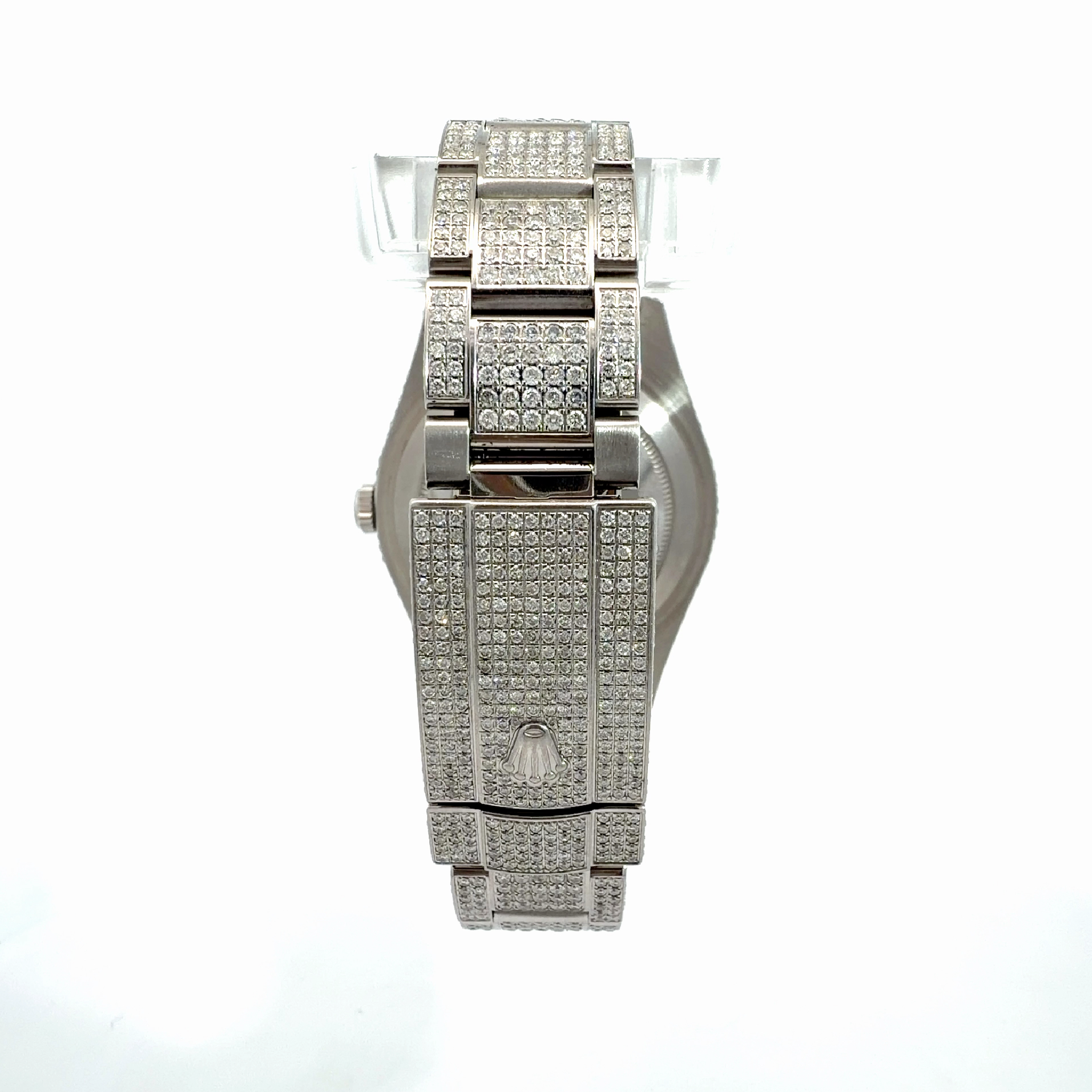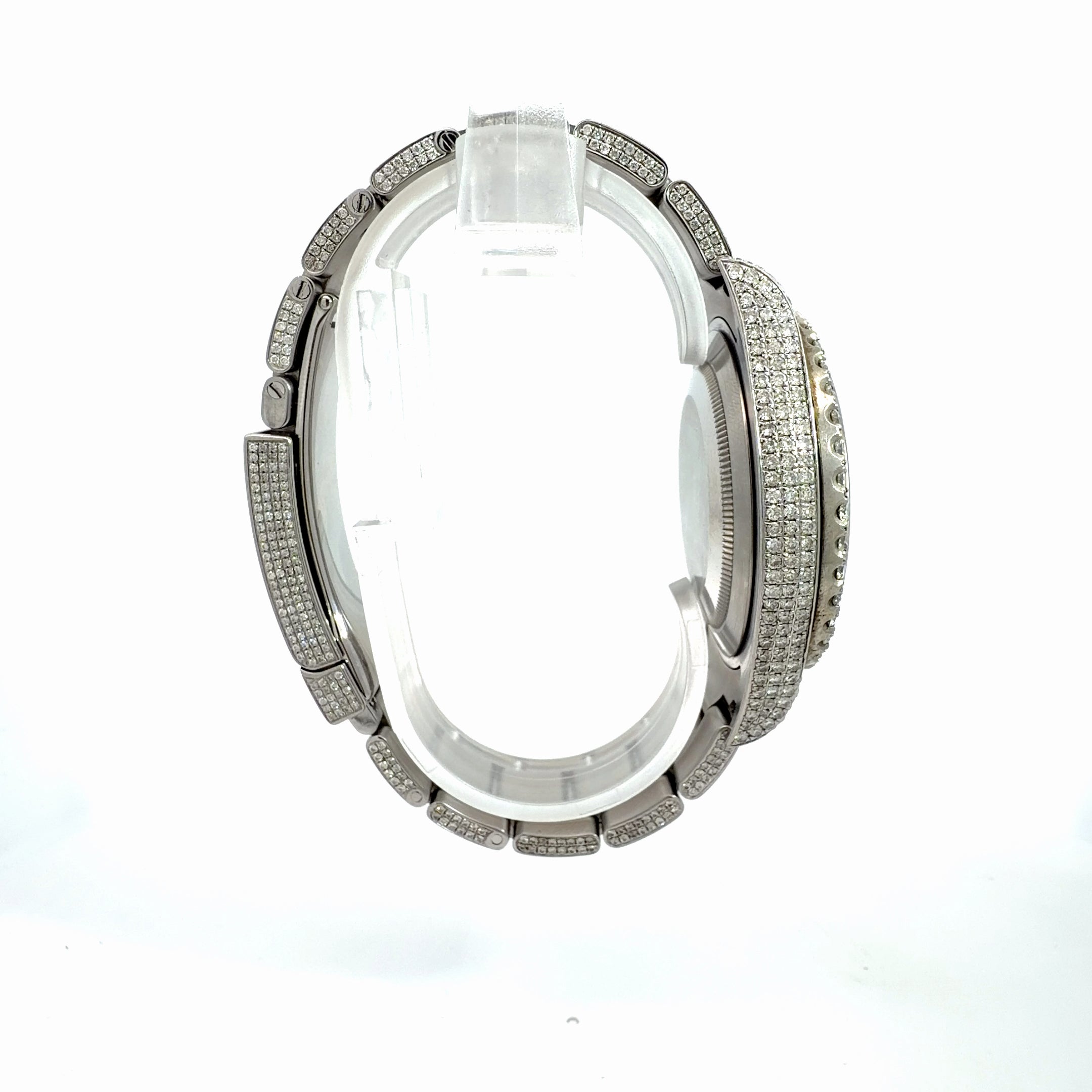 Make a bold statement with this Rolex Datejust II Ref. 116300, a modern icon reimagined with a dazzling "iced out" custom diamond case, bezel, strap, and buckle. This 41mm timepiece combines Rolex's renowned craftsmanship with head-turning luxury, perfect for those who appreciate standout style and top-tier performance. The watch features a stainless steel case and Oyster bracelet, completely custom-set with high quality diamonds across the bezel, dial, case, and bracelet. The result is a brilliant, fully iced-outlook that commands attention without compromising the watch's original integrity and function. The 116300 is larger and bolder than traditional Datejust models-featuring thicker lugs, a wider bezel, and a more commanding wrist presence. Inside, it's powered by a Rolex automatic self-winding movement, delivering precision, reliability, and a 100-meter water resistance rating. The sapphire crystal and Cyclops date lens ensure both durability and visibility.Â