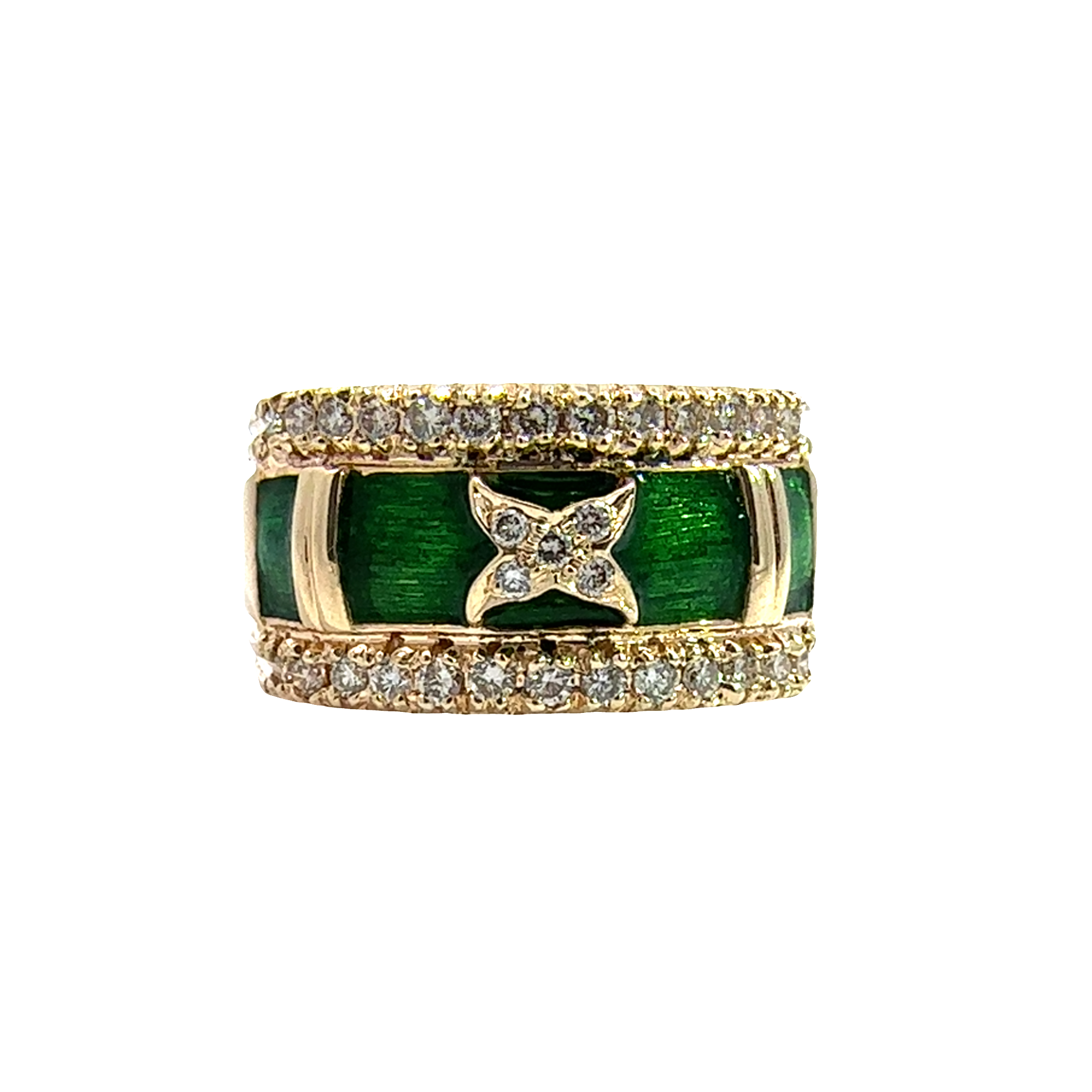 This vintage 14k yellow gold band features a unique combination of sparkling 0.31ctw diamonds and vibrant green enamel detailing. Its classic design paired with colorful accents offers a timeless yet eye-catching piece that enhances any jewelry collection. Perfect for adding a sophisticated touch to everyday wear or special occasions.