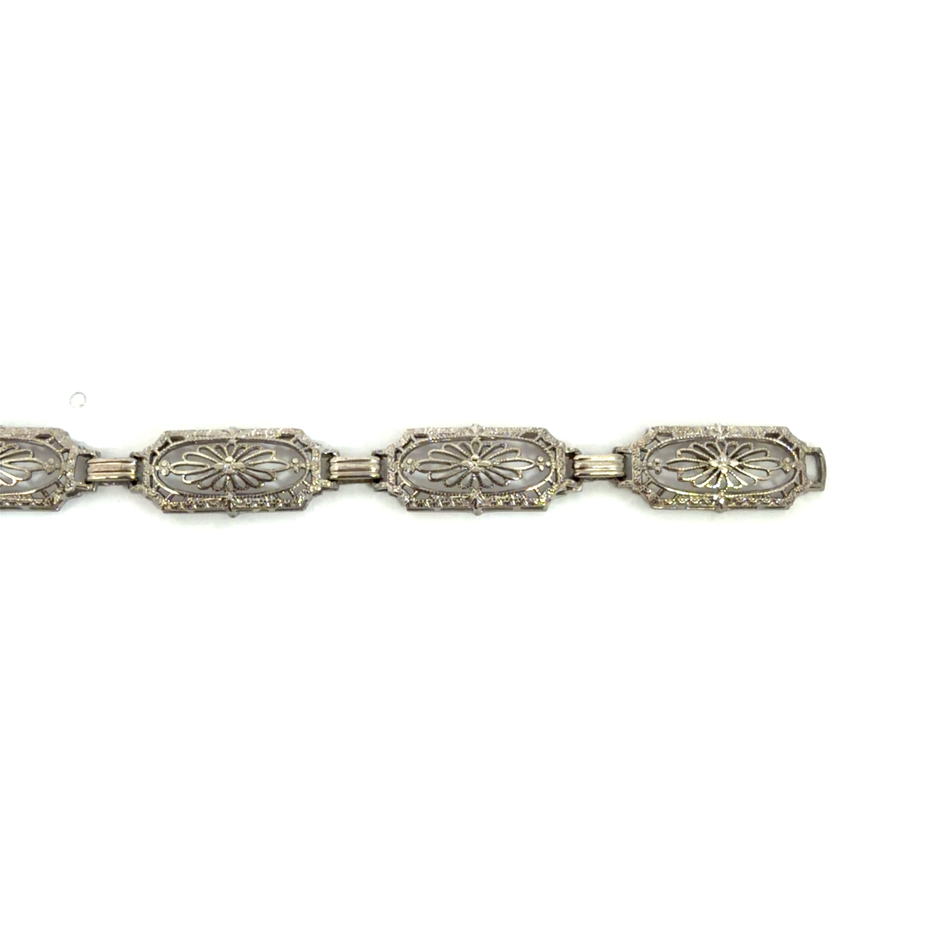 This stunning vintage filigree bracelet blends the best of both worlds with its platinum and gold mixed metal design. The showstopper? A gorgeous diamond nestled in the center of a luminous camphor glass link that catches the light beautifully. Perfect for adding a touch of old-world glamour with a modern twist to any jewelry collection. A true conversation piece that whispers elegance and timeless style.