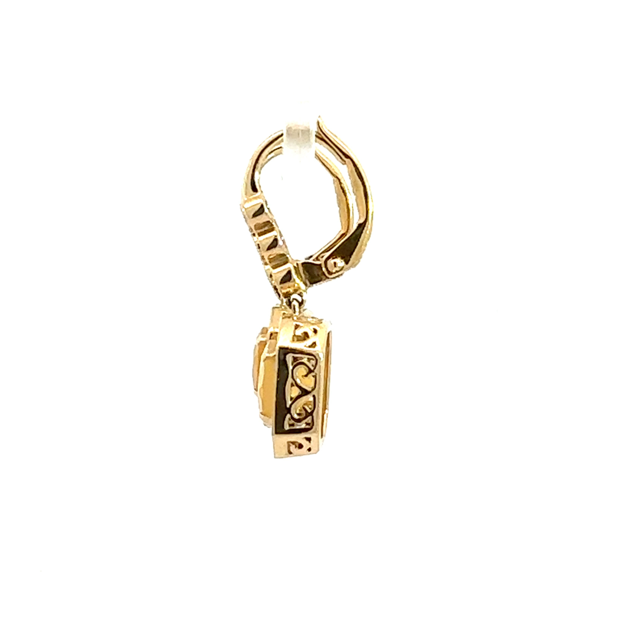 Glowing with warmth and sparkle, these vintage earrings are crafted in 18k yellow gold and set with fiery orange opals. Each vibrant center stone is framed in a halo of brilliant diamonds, including both round and baguette cuts that add texture and radiance. Suspended from diamond-accented drops, the design balances bold color with refined elegance. A striking pair that brings together vintage charm, luxurious craftsmanship, and a touch of playful sophistication.