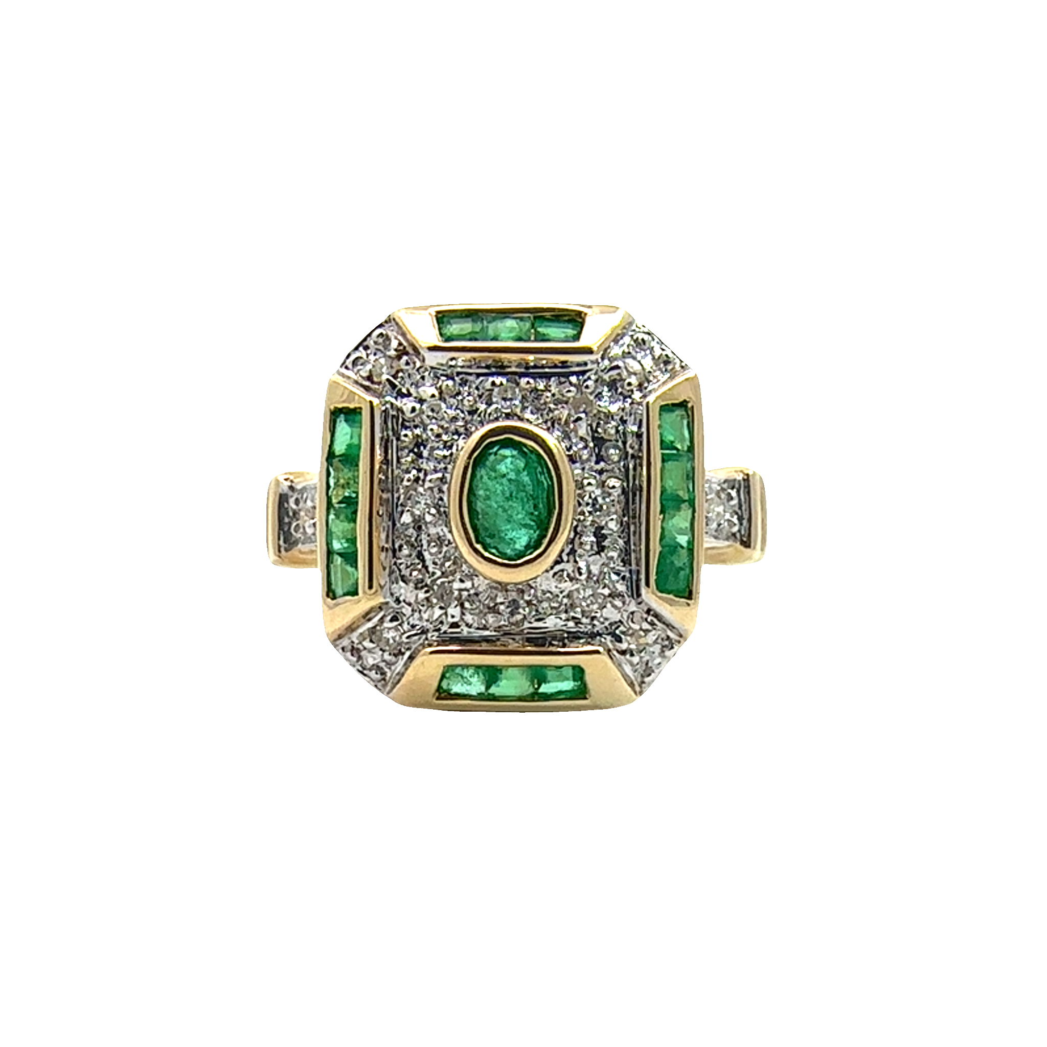 A true statement piece, this vintage cocktail ring is crafted in warm yellow gold and centered with a vibrant oval emerald. The gem’s rich green hue and polished finish draw the eye instantly, while sparkling diamond accents and intricate detailing add elegance and depth. Both bold and refined, it’s a ring that beautifully balances timeless sophistication with vintage charm.