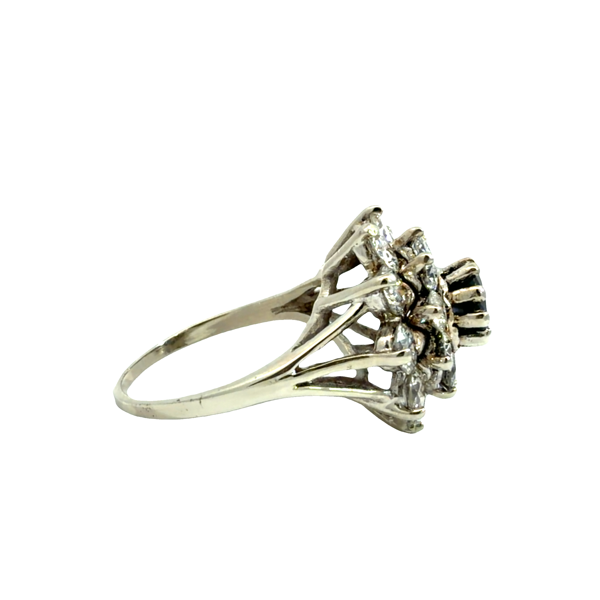 Enhance your style with this exquisite white gold cocktail ring. Showcasing a flawlessly set round brilliant sapphire, its rich blue tone captivates instantly. Encircled by a diamond halo arranged like delicate flower petals, this ring is a luxurious statement of elegance and timeless beauty you won't want to miss.