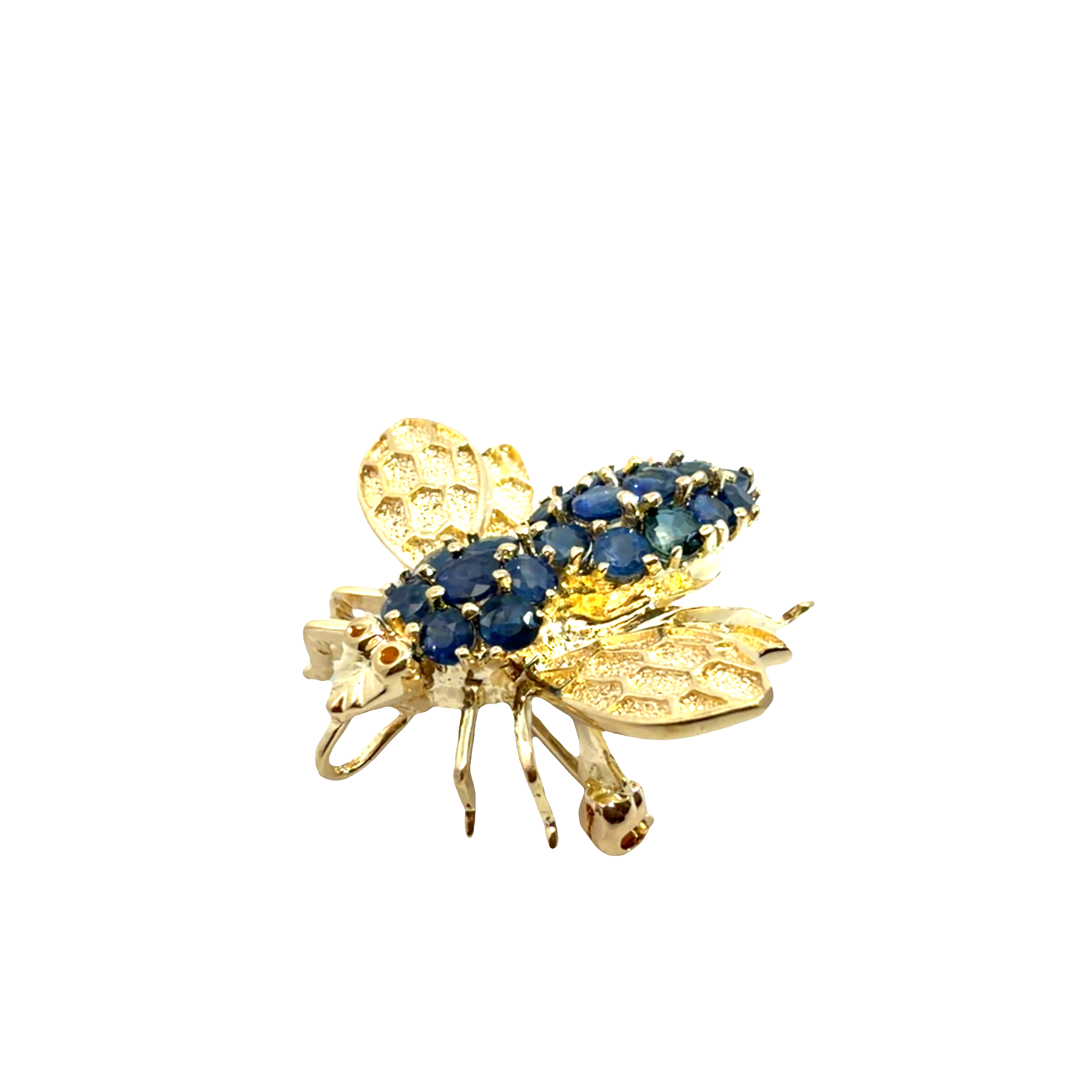 This charming bee brooch, crafted in shiny yellow gold, is a delightful way to accessorize. Its body sparkles with a bunch of rich blue sapphires that catch the eye. Perfect for adding a playful, nature-inspired sparkle to your outfit!