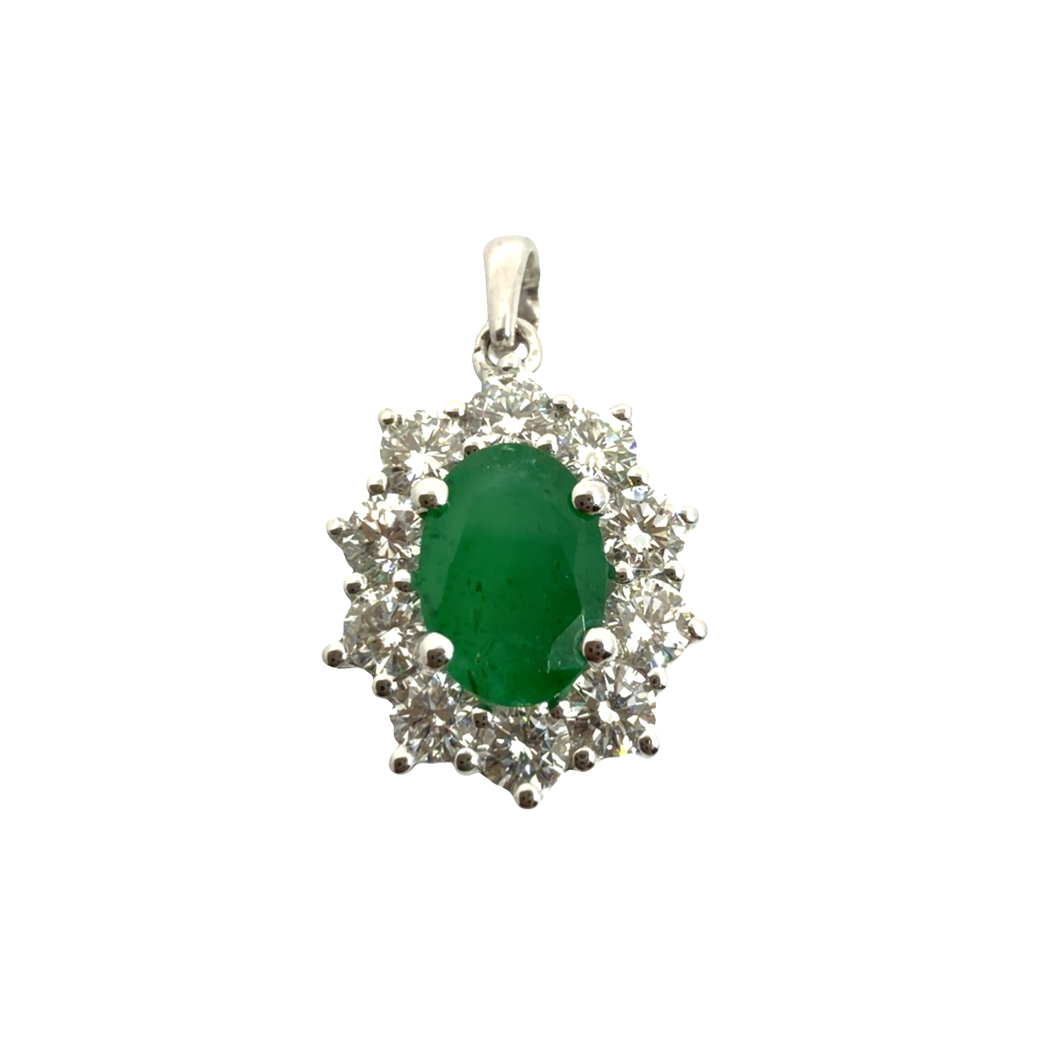 This beautifully designed pendant showcases a vivid oval emerald celebrated for its rich green shade and striking beauty. Encased in elegant white gold and encircled by a sparkling diamond halo, its timeless design adds a touch of refined sophistication to any jewelry ensemble. An ideal symbol of elegance and luxury.